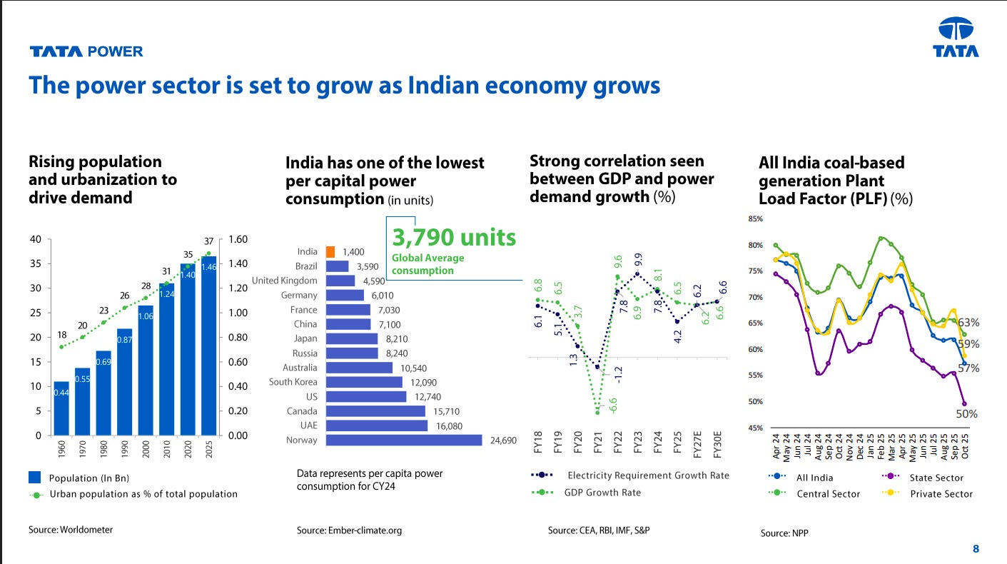 Power demand in India is structurally supported by population growth, urbanization, and low per-capita electricity consumption versus global averages. A strong correlation between GDP growth and electricity demand reinforces the long-term expansion outlook for the power sector.