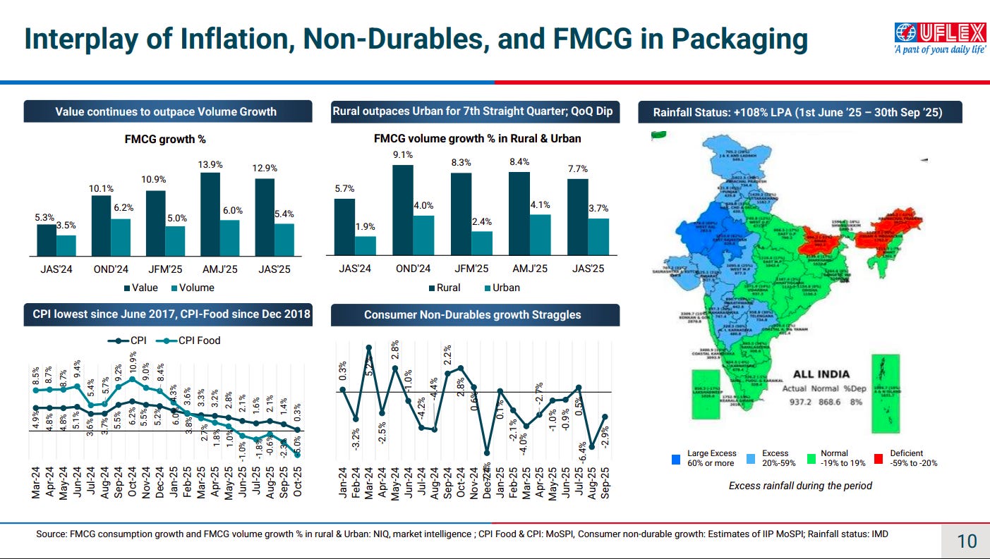 FMCG value growth continues to outpace volume growth, driven by pricing, while rural demand has consistently outperformed urban over the past several quarters. Moderating CPI, strong monsoons (+108% LPA), and gradual rural recovery provide a supportive backdrop for packaging demand.