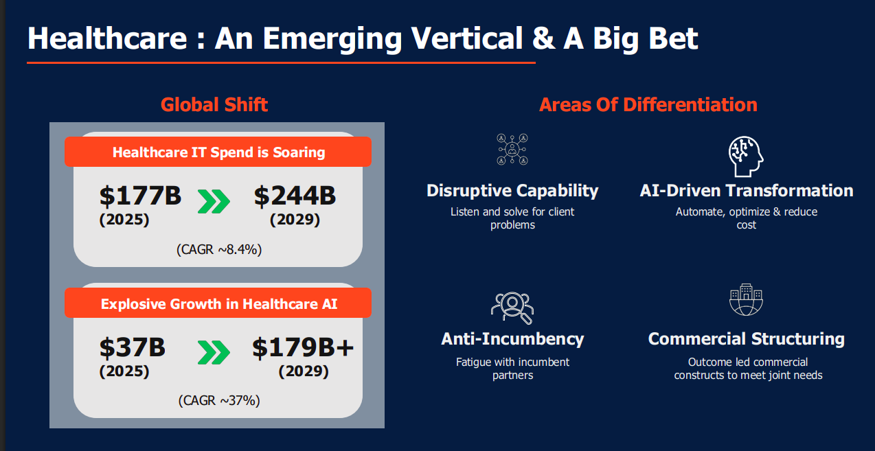 Healthcare is emerging as a major growth engine, with global healthcare IT spend rising from $177 billion in 2025 to $244 billion by 2029. Healthcare AI is growing even faster, scaling from $37 billion to over $179 billion in the same period. Coforge differentiates through AI-driven transformation, disruptive delivery models, and outcome-linked commercial structures.