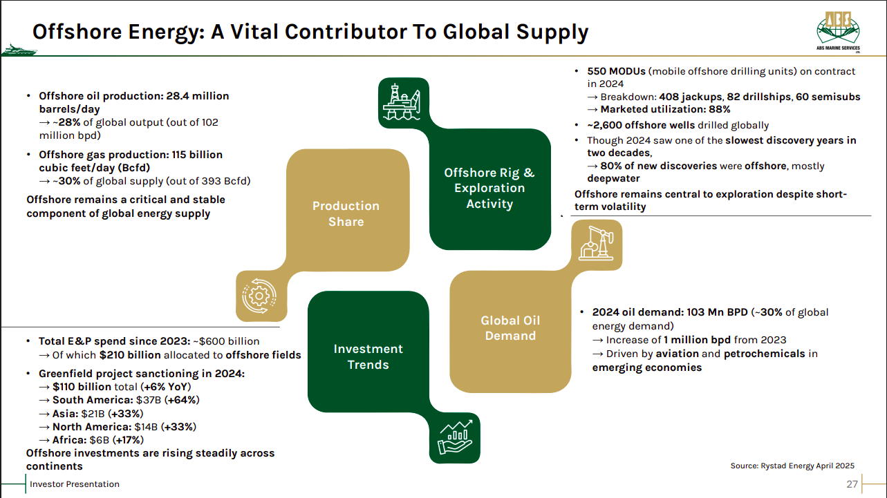 Offshore energy remains central to global oil and gas supply, contributing ~30% of global output, with utilization and investment levels staying resilient despite short-term volatility. Rising offshore E&P spending, deepwater discoveries, and steady global oil demand underpin sustained offshore activity.