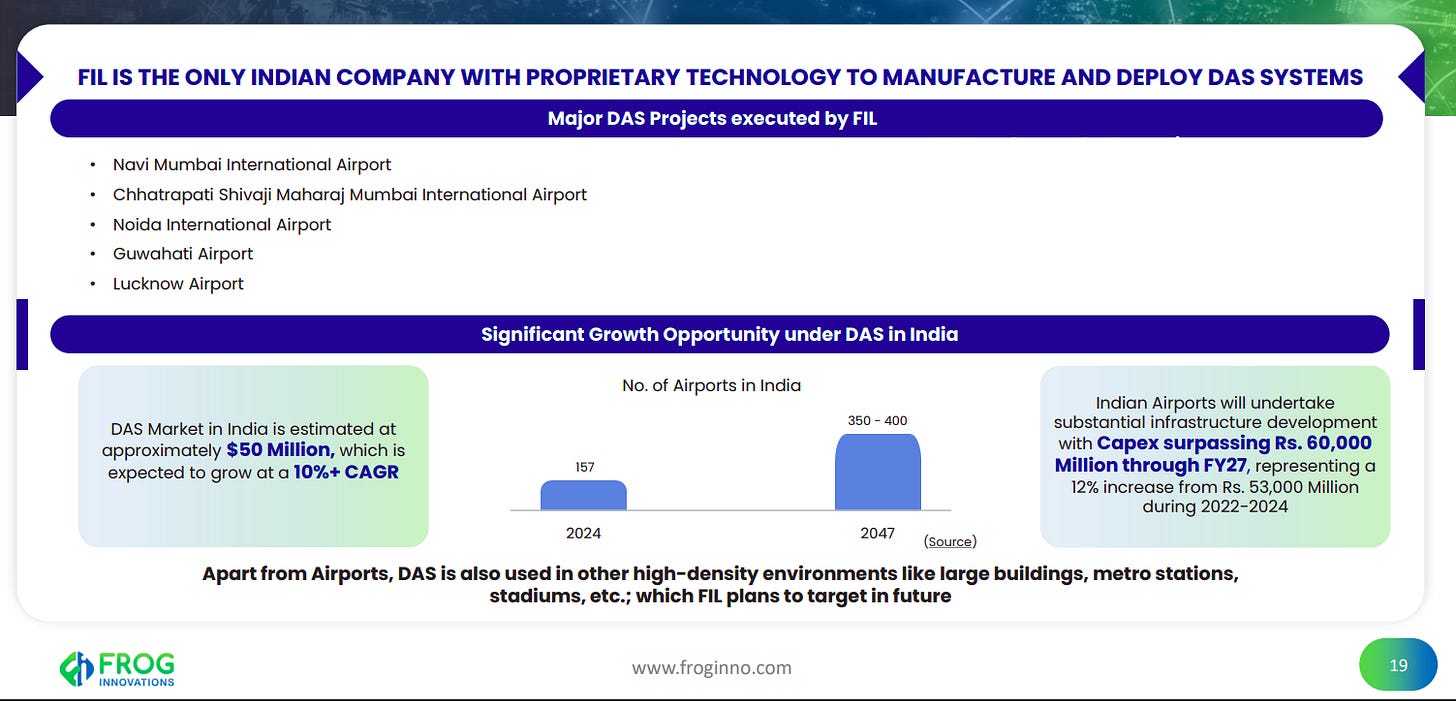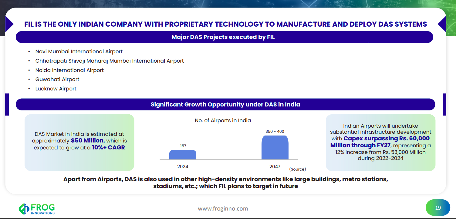 FIL is the only Indian player with proprietary DAS technology, with marquee airport deployments already executed. With India’s DAS market at ~$50 million and growing at 10%+ CAGR, rising airport capex and expansion beyond airports into metros, stadiums, and large buildings create a strong growth runway.