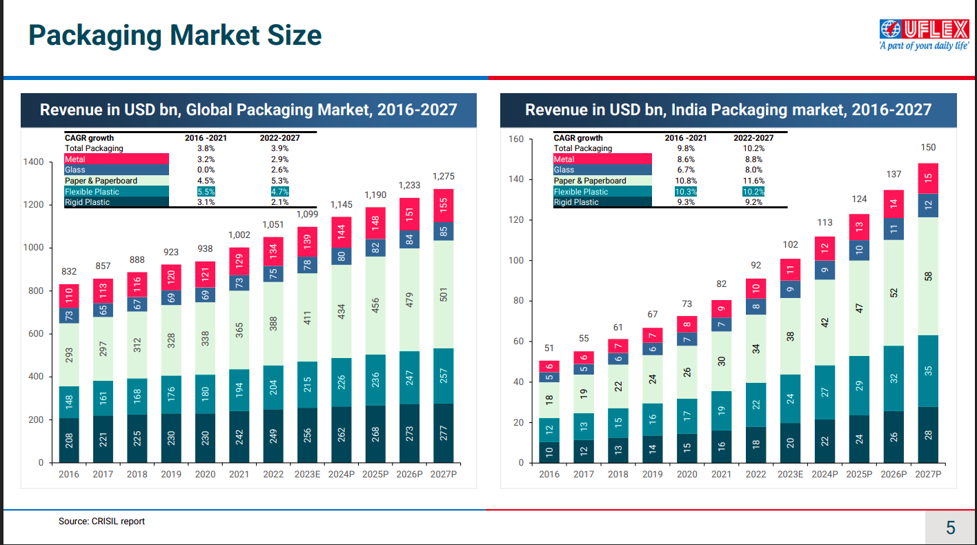The global packaging market is growing steadily, while India’s packaging market is expanding at a materially higher CAGR, led by flexible plastics and paperboard. Structural drivers like urbanization, organized retail, and e-commerce continue to fuel long-term demand growth.