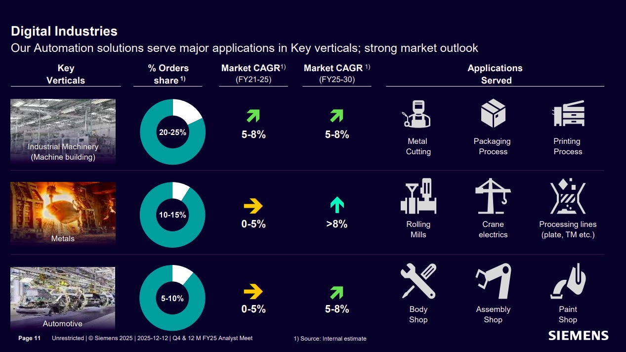 Siemens’ Digital Industries segment serves core manufacturing verticals such as industrial machinery, metals, and automotive, with order shares of 5–25% across segments. While near-term growth is moderate in some sectors, medium-term demand is supported by automation, electrification, and process optimization across cutting, packaging, rolling mills, and assembly lines.