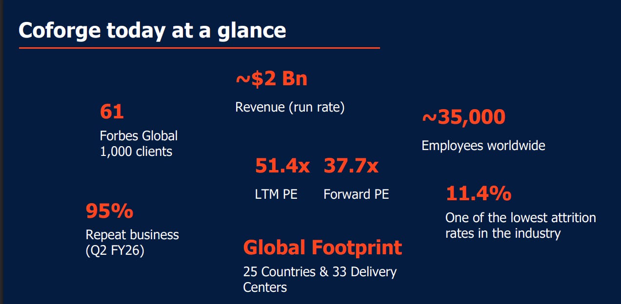 Coforge operates at a ~$2 billion revenue run rate with ~35,000 employees across 25 countries and 33 delivery centers. The company serves 61 Forbes Global 1000 clients, enjoys ~95% repeat business, and maintains one of the lowest attrition rates in the industry at 11.4%. Valuations reflect strong growth expectations with elevated LTM and forward PEs.