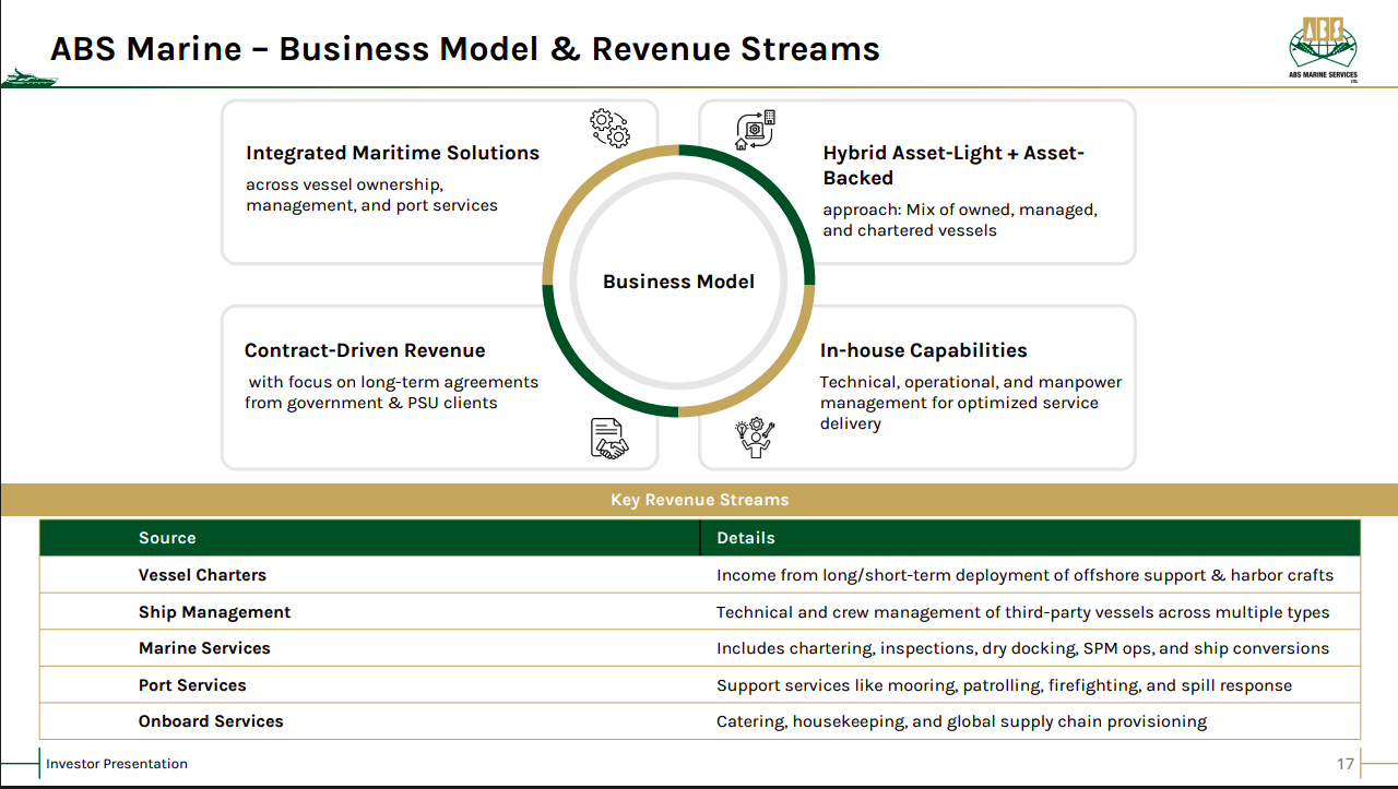 ABS Marine operates an integrated, contract-driven maritime model combining asset-light and asset-backed strategies across vessel ownership, management, and port services. Long-term PSU and government contracts, supported by strong in-house technical and operational capabilities, ensure revenue visibility and stability.