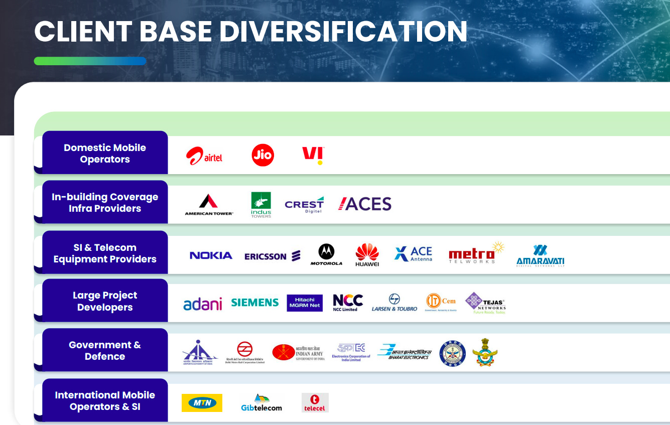 FIL has a well-diversified customer base spanning domestic and international telecom operators, infrastructure providers, OEMs, large project developers, and government/defence agencies. This diversification reduces dependence on any single segment and strengthens revenue stability.