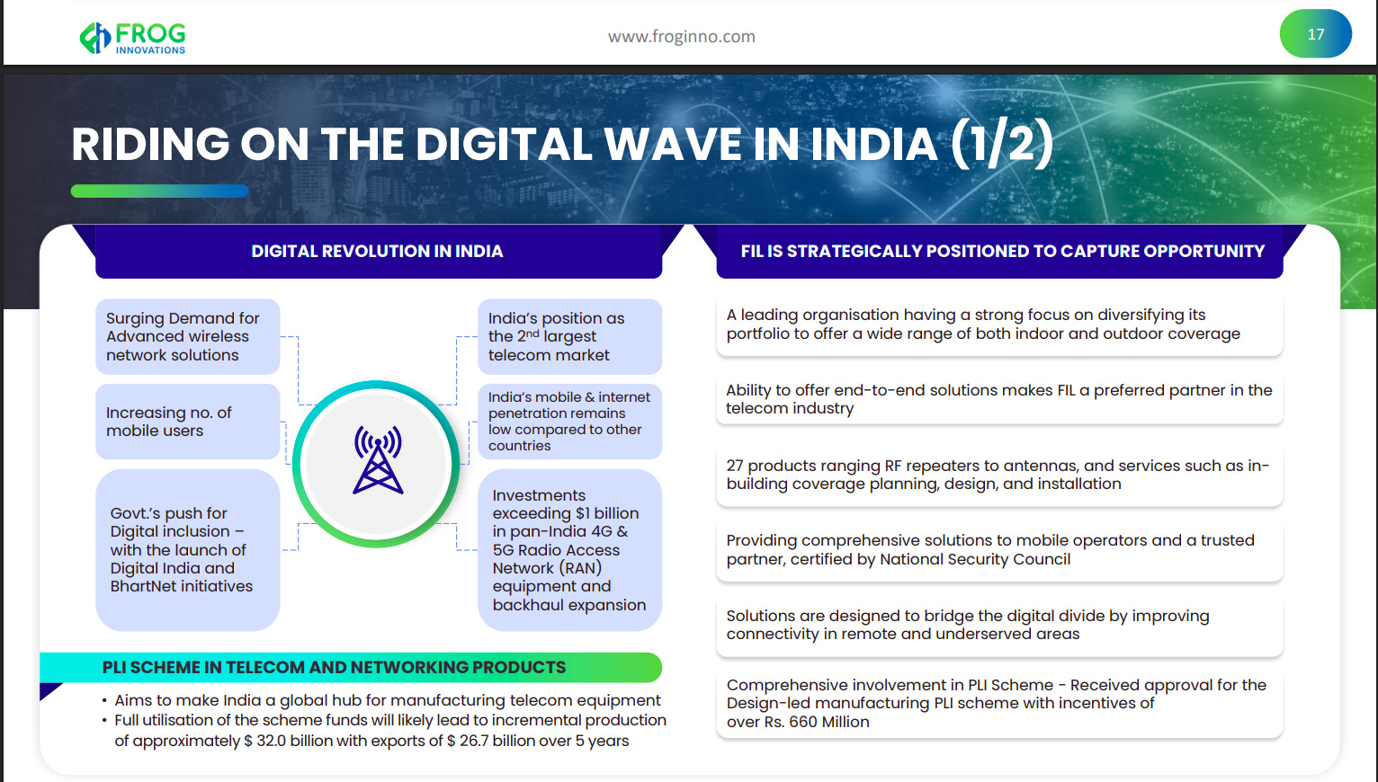 India’s rapid digital adoption, rising mobile penetration, and heavy investments in 4G/5G networks are driving demand for advanced wireless solutions. FIL is strategically positioned with end-to-end offerings, a wide product portfolio, and PLI support to capture this growth.
