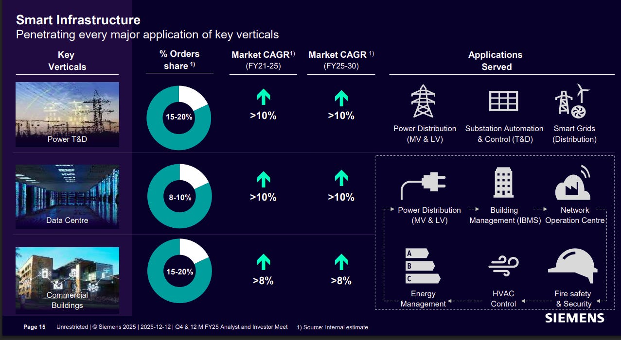 Siemens’ Smart Infrastructure business has deep penetration across power T&D, data centres, and commercial buildings, with order shares ranging from 8–20% and strong double-digit market growth visibility. Its integrated offerings span power distribution, substation automation, smart grids, building management, energy efficiency, and safety systems, positioning it well for sustained urban and infrastructure growth.