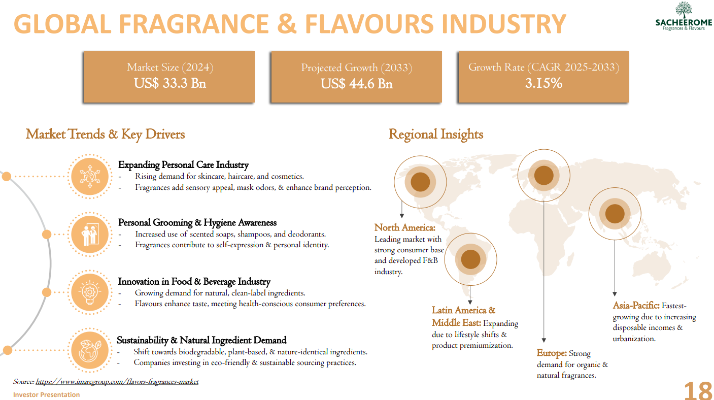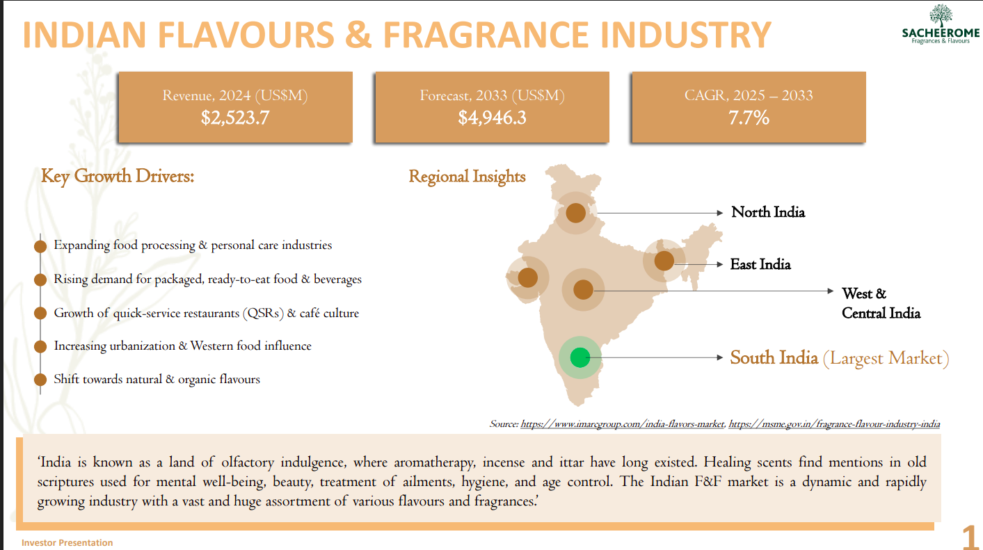 India’s flavours and fragrance market is a fast-growing domestic opportunity, with revenues of about US$2.5 bn in 2024 expected to nearly double to ~US$4.9 bn by 2033 at a ~7.7% CAGR. Growth is driven by food processing, packaged foods, QSR expansion, urbanization, and a shift toward natural and organic flavours, with South India emerging as the largest regional market.