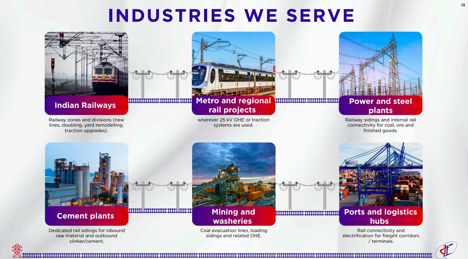 The company serves a diversified set of infrastructure-heavy sectors including Indian Railways, metro and regional rail projects, power and steel plants, cement plants, mining and washeries, and ports and logistics hubs. These industries rely on rail electrification, traction systems, and OHE infrastructure for efficient bulk movement and connectivity.