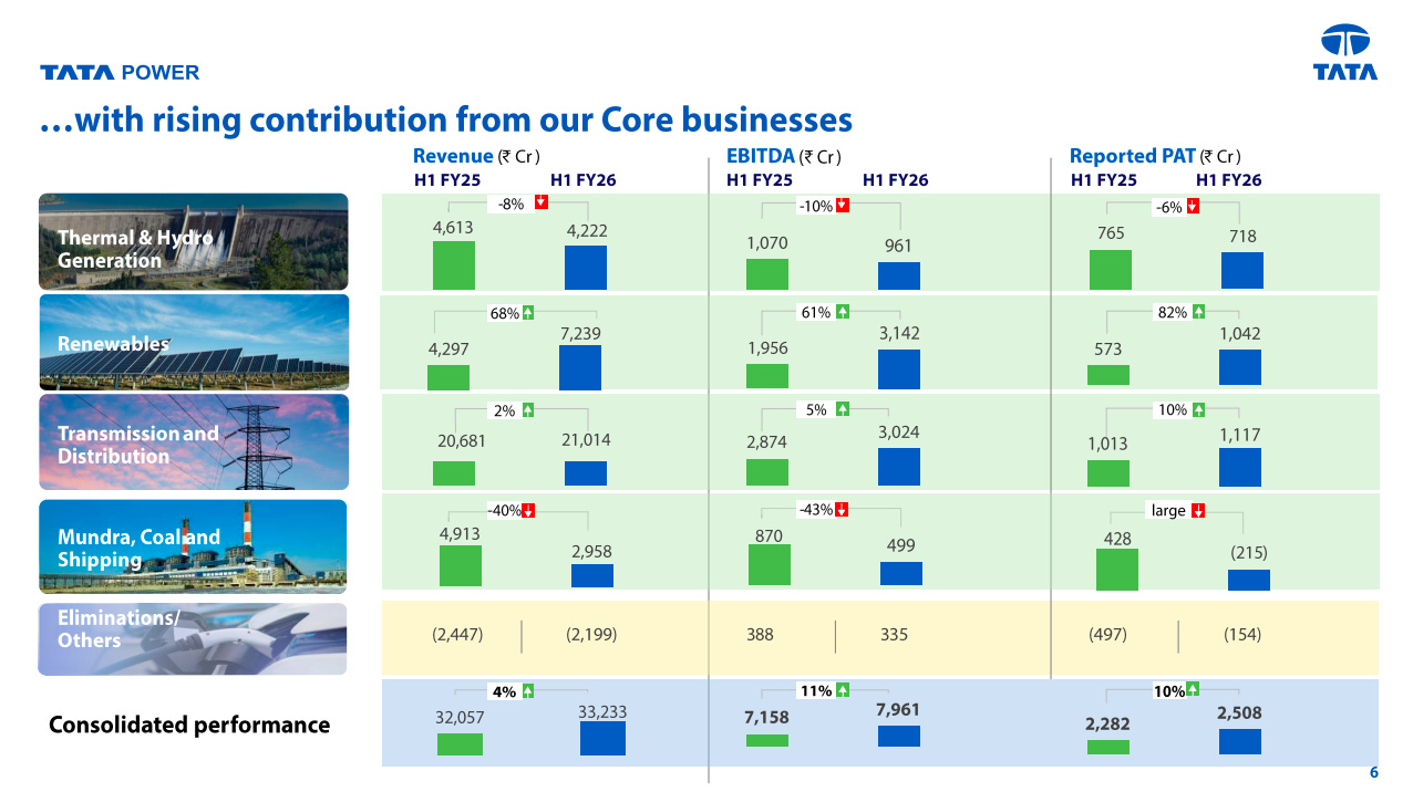 Tata Power’s core businesses are increasingly driving performance, with renewables and transmission delivering strong growth in revenue, EBITDA, and PAT. While thermal and coal-linked segments saw moderation, consolidated profitability continues to improve year-on-year.