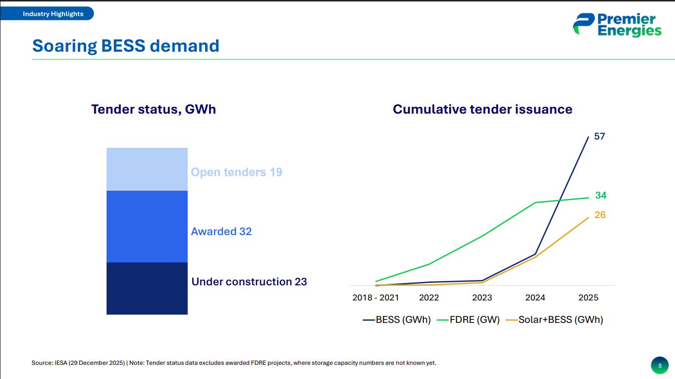 Battery energy storage demand is accelerating rapidly, with cumulative tenders scaling sharply and a healthy pipeline across awarded, under-construction, and open projects. Growth is being driven by FDRE tenders and solar-plus-storage deployments.