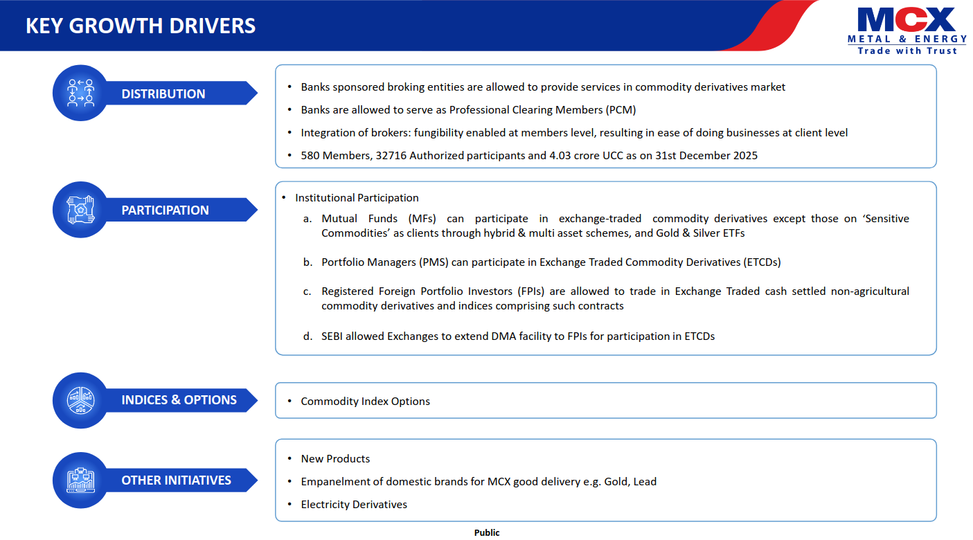 Regulatory changes enabling bank participation, institutional access (MFs, PMS, FPIs), and clearing reforms are structurally expanding the commodity derivatives ecosystem. New products, index options, electricity derivatives, and broader delivery participation add incremental growth levers.