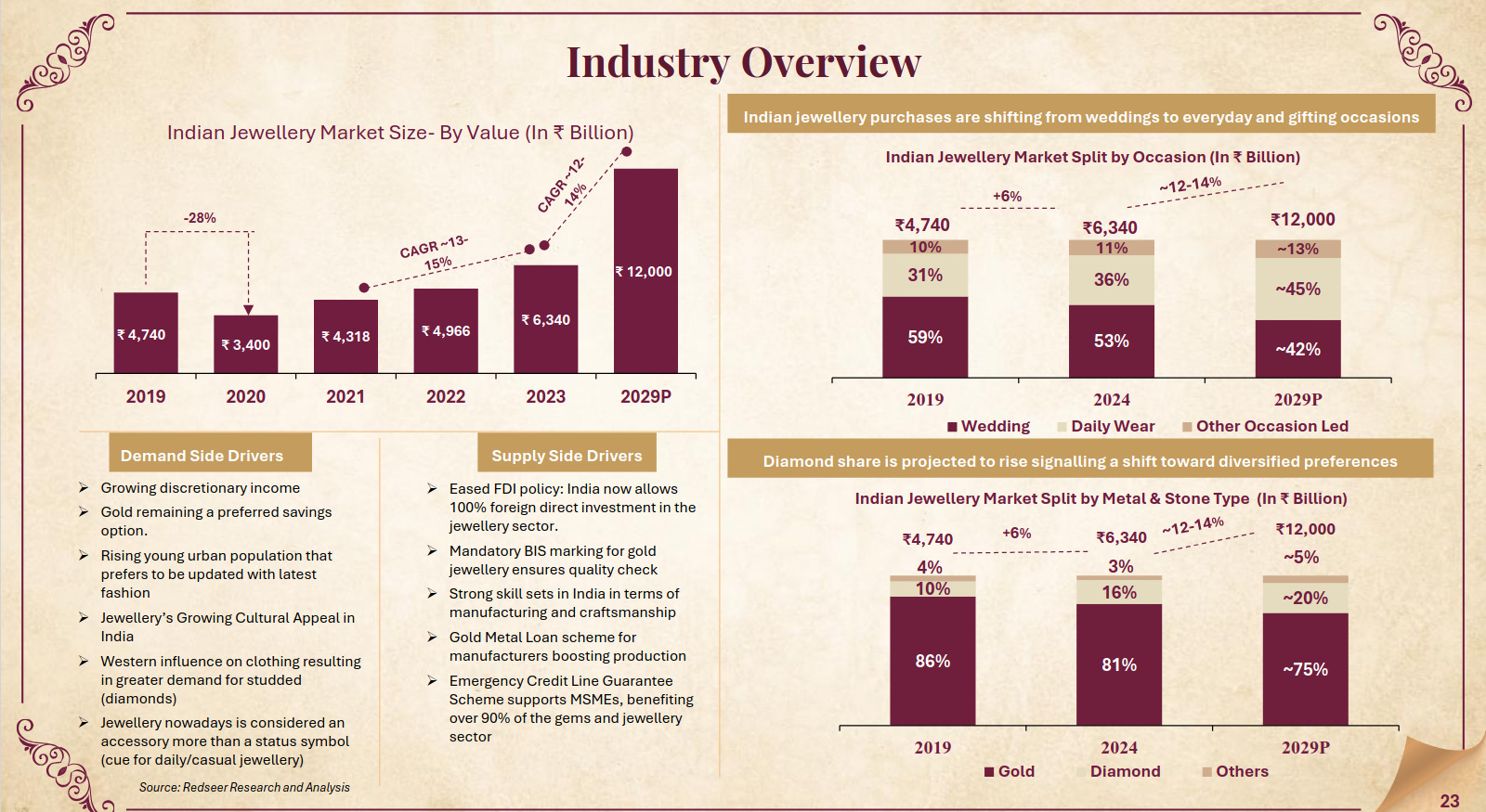 The Indian jewellery market is on a strong growth trajectory, rebounding sharply post-2020 and projected to reach ~₹12 trillion by 2029. Demand is shifting from wedding-led purchases toward daily wear and gifting, while diamonds and alternative materials gain share alongside gold.