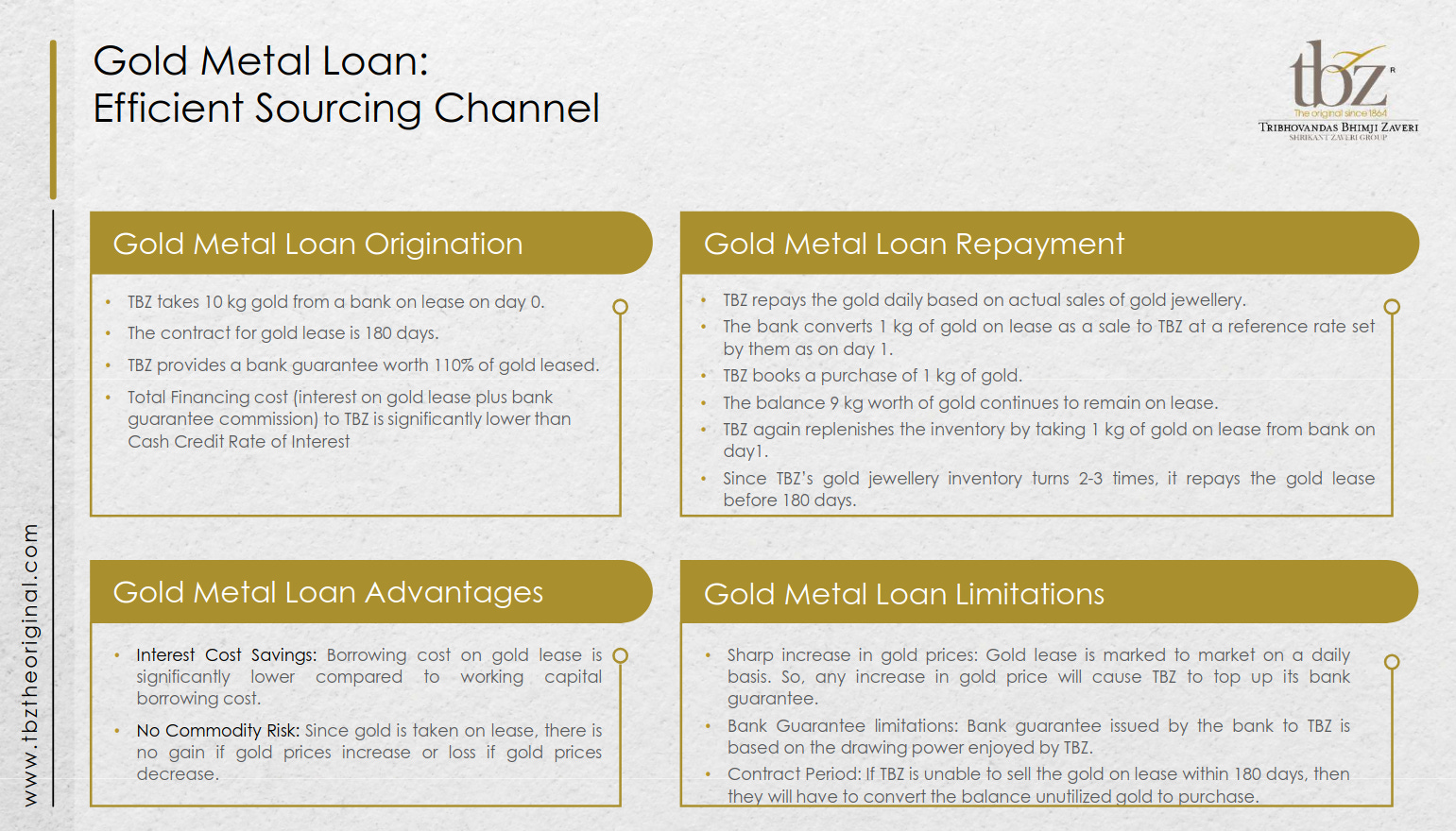 TBZ uses gold metal loans to source inventory at a lower financing cost than cash credit, backed by bank guarantees and short lease cycles. Daily repayment is linked to jewellery sales, allowing faster inventory turns and early lease closure, though sharp gold price moves can increase collateral requirements.