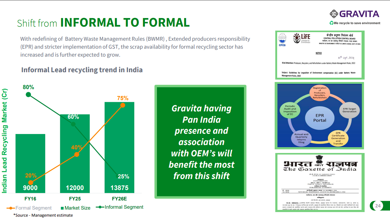 Regulatory tightening through BWMR, EPR norms, and GST is accelerating the shift of lead recycling from the informal to the formal sector. With pan-India presence and strong OEM linkages, Gravita is well positioned to capture a larger share of this expanding formal market.