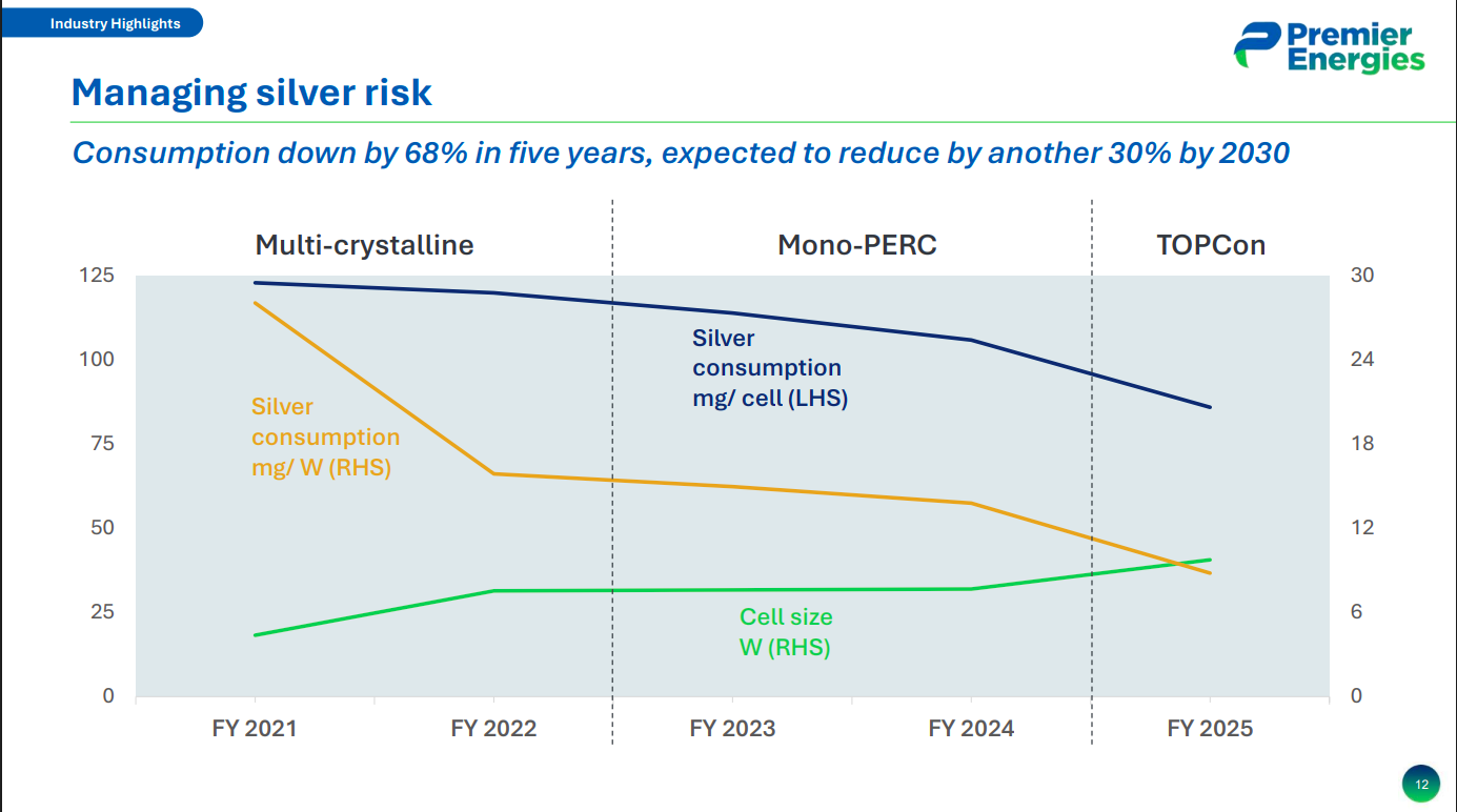 Silver consumption per solar cell has fallen sharply (~68% over five years) due to technology shifts from multi-crystalline to Mono-PERC and TOPCon. Ongoing efficiency gains and larger cell sizes are expected to reduce silver usage by another ~30% by 2030, lowering cost volatility risk.