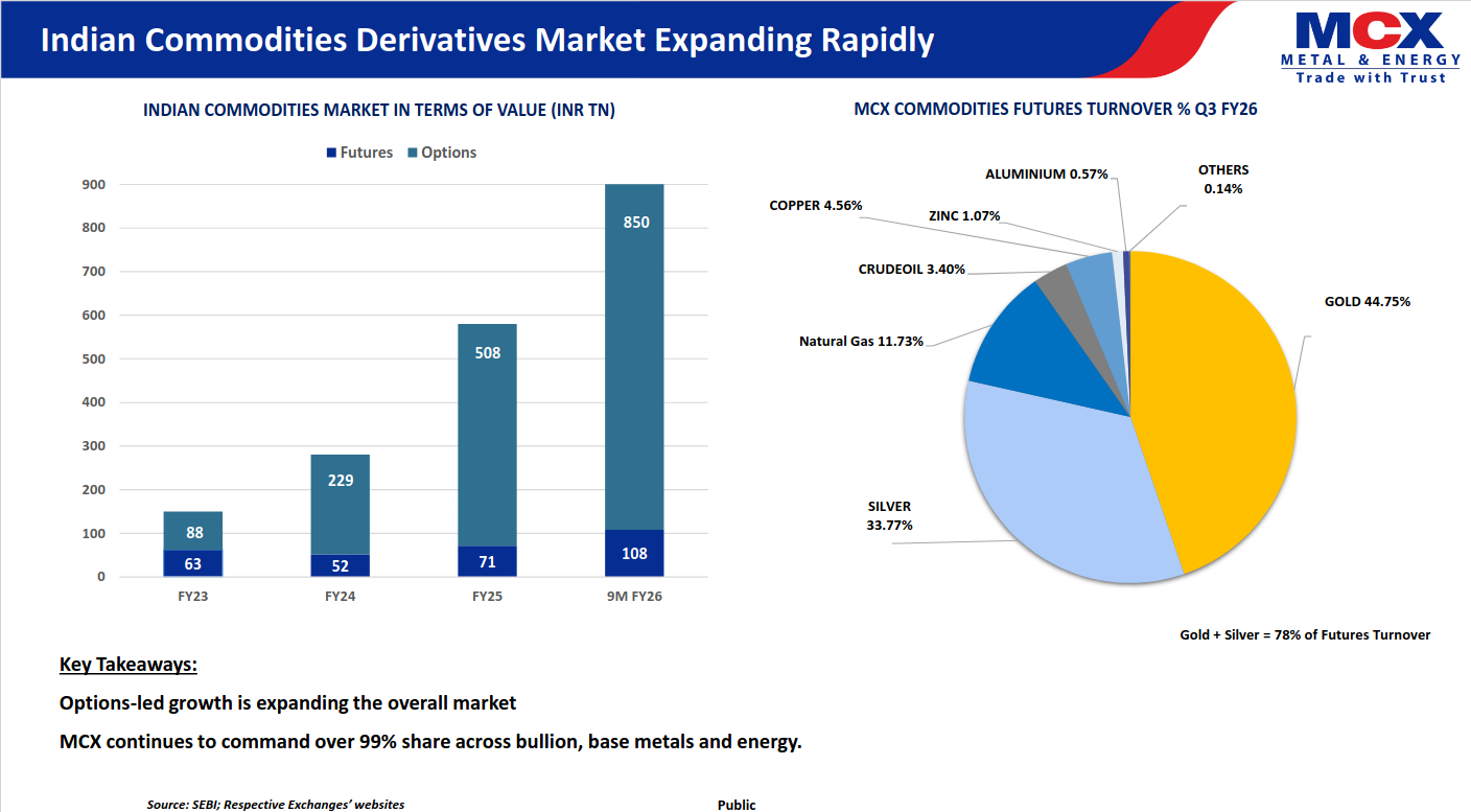 Options-led growth is significantly expanding the overall commodities market value, with MCX maintaining dominant market share across bullion, base metals, and energy. Gold and silver continue to anchor volumes, accounting for ~78% of futures turnover.