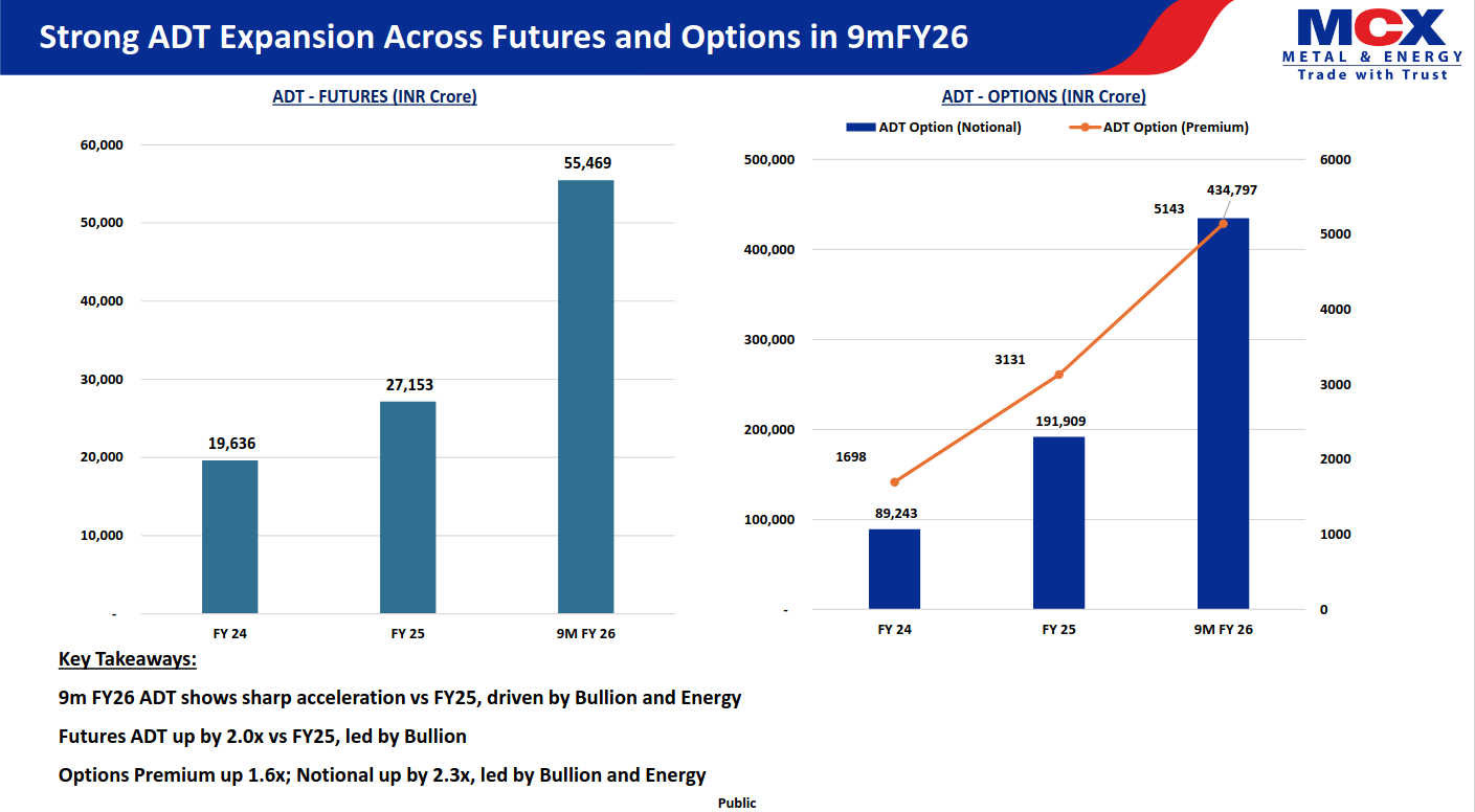 MCX delivered sharp acceleration in average daily turnover during 9M FY26, led by bullion and energy contracts. Futures ADT (Average Daily Turnover) doubled vs FY25, while options saw strong traction with premium up ~1.6× and notional volumes up ~2.3×.