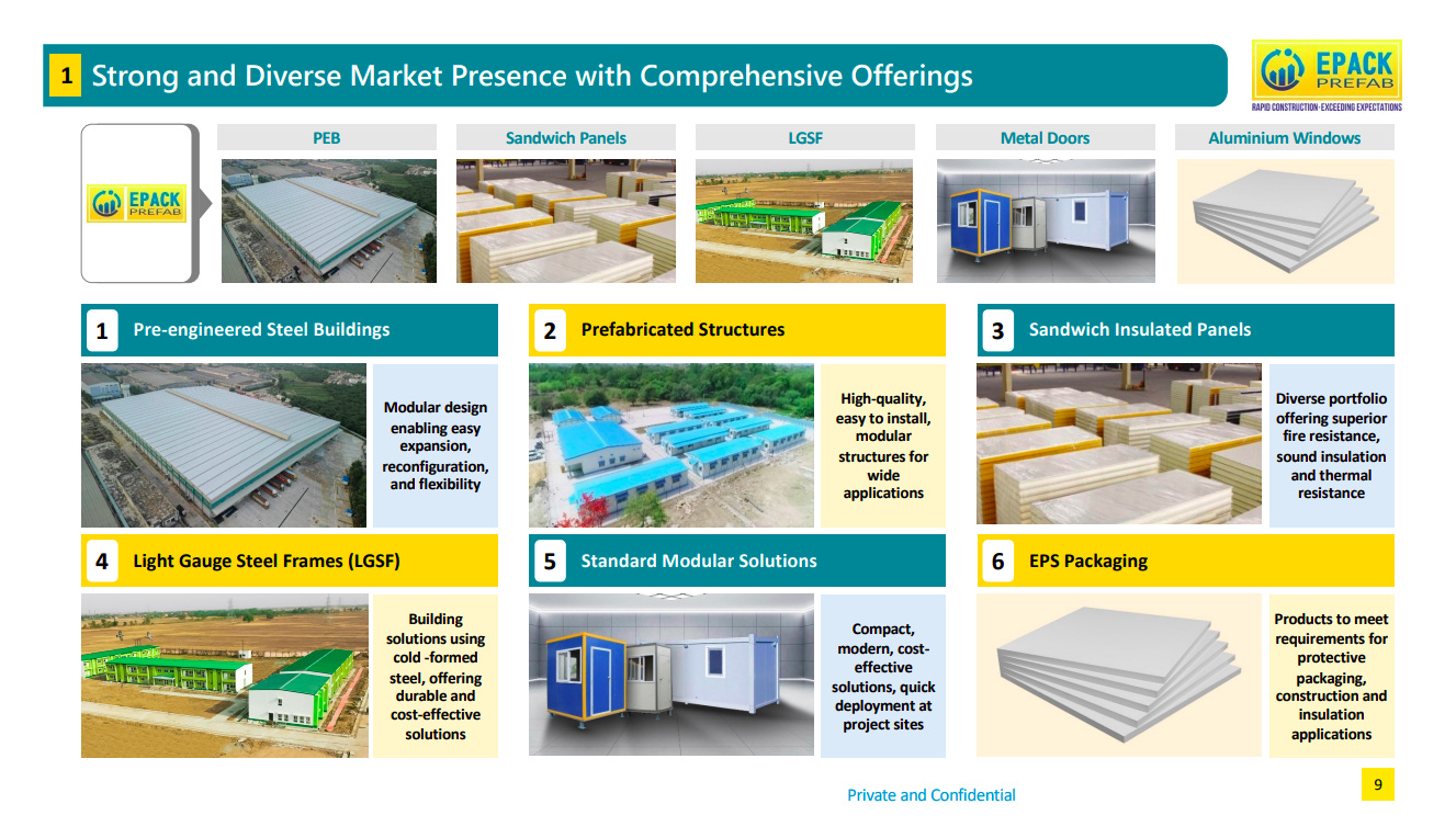EPack offers a wide range of prefab solutions including PEBs, prefabricated structures, sandwich panels, LGSF, modular units, and EPS packaging. This broad product mix enables it to address varied use cases across industrial, commercial, and infrastructure projects.