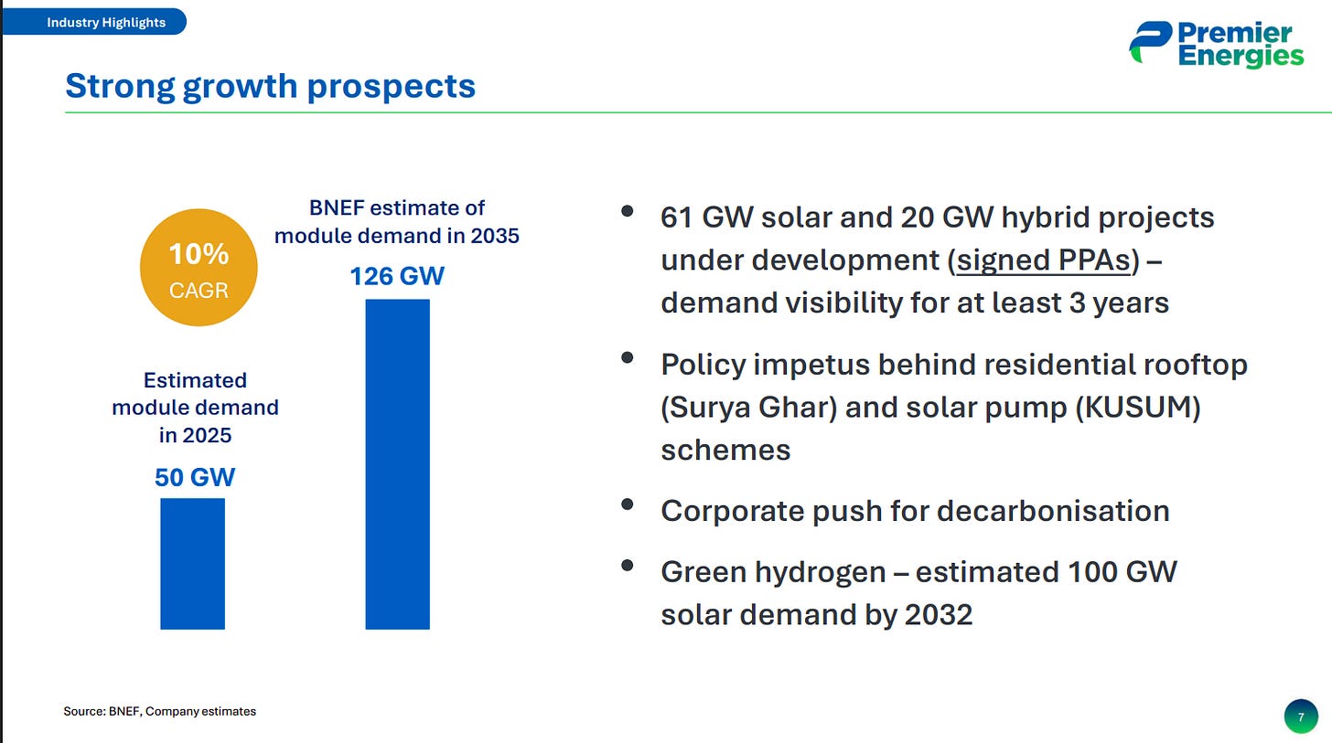 India’s solar module demand is expected to grow at ~10% CAGR, rising from ~50 GW in 2025 to ~126 GW by 2035. Signed PPAs, rooftop solar schemes, decarbonisation commitments, and green hydrogen projects provide multi-year demand visibility.