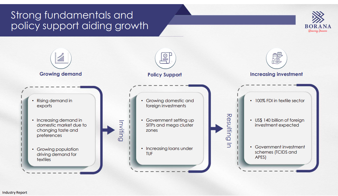Growth is supported by rising export and domestic demand, backed by government initiatives like SITPs, mega clusters, and easier access to finance. Policy support and 100% FDI are driving sustained investment inflows into the textile sector.
