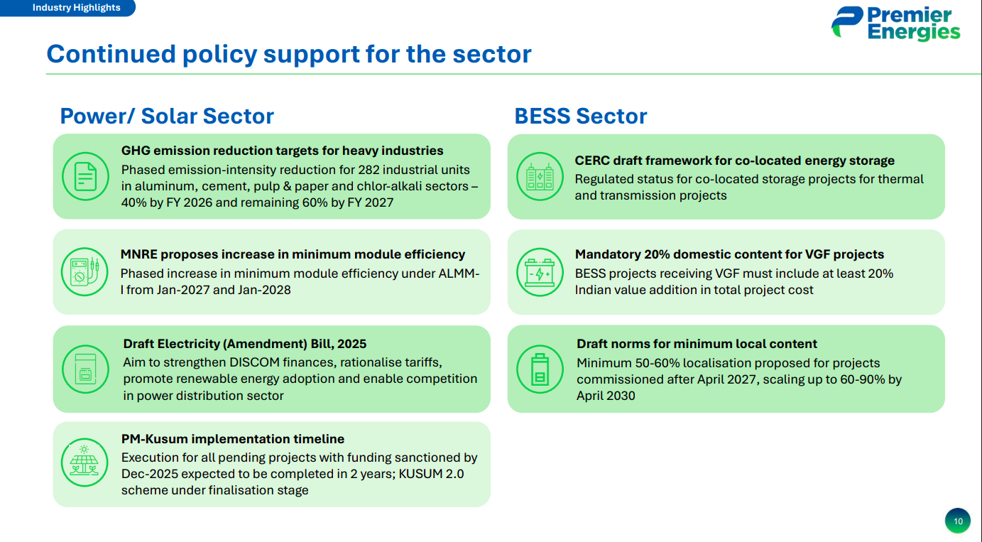 Strong regulatory backing across solar and BESS is driving long-term visibility, including tighter emission norms, higher module efficiency standards, and DISCOM reforms. Domestic content mandates and localisation targets further strengthen India’s renewable manufacturing ecosystem.
