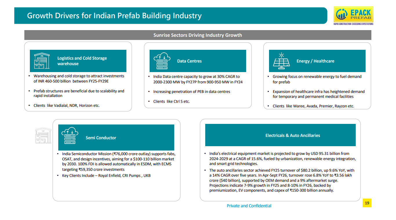 Sunrise sectors like logistics & cold storage, data centres, renewables, healthcare, semiconductors, and auto ancillaries are driving prefab demand. Prefab solutions benefit from faster execution, scalability, and alignment with India’s capex and infrastructure push.