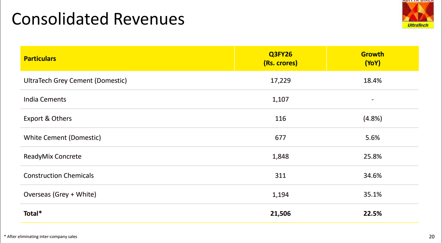 UltraTech reported strong topline growth of 22.5% YoY, led by domestic grey cement, ready-mix concrete, construction chemicals, and overseas operations. Growth was broad-based, with higher value-added segments outpacing core volumes.