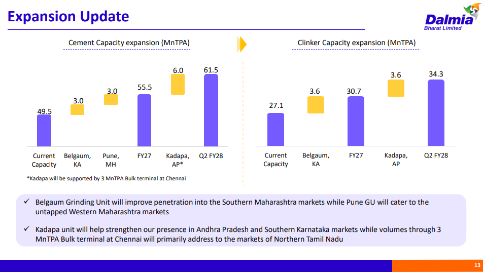 Dalmia Bharat is ramping up both cement and clinker capacity through multiple expansions. Current cement capacity of 49.5 MnTPA will jump to 61.5 MnTPA by Q2 FY28, with new units coming up in Belgaum and Pune in Karnataka and Maharashtra, plus a major expansion in Kadapa, Andhra Pradesh. On the clinker side, capacity will grow from 27.1 MnTPA to 34.3 MnTPA over the same period. The Belgaum grinding unit targets southern Maharashtra, while Pune focuses on untapped western Maharashtra markets, and the Kadapa unit—supported by a 3 MnTPA bulk terminal in Chennai—will strengthen their presence in Andhra Pradesh, southern Karnataka, and northern Tamil Nadu.
