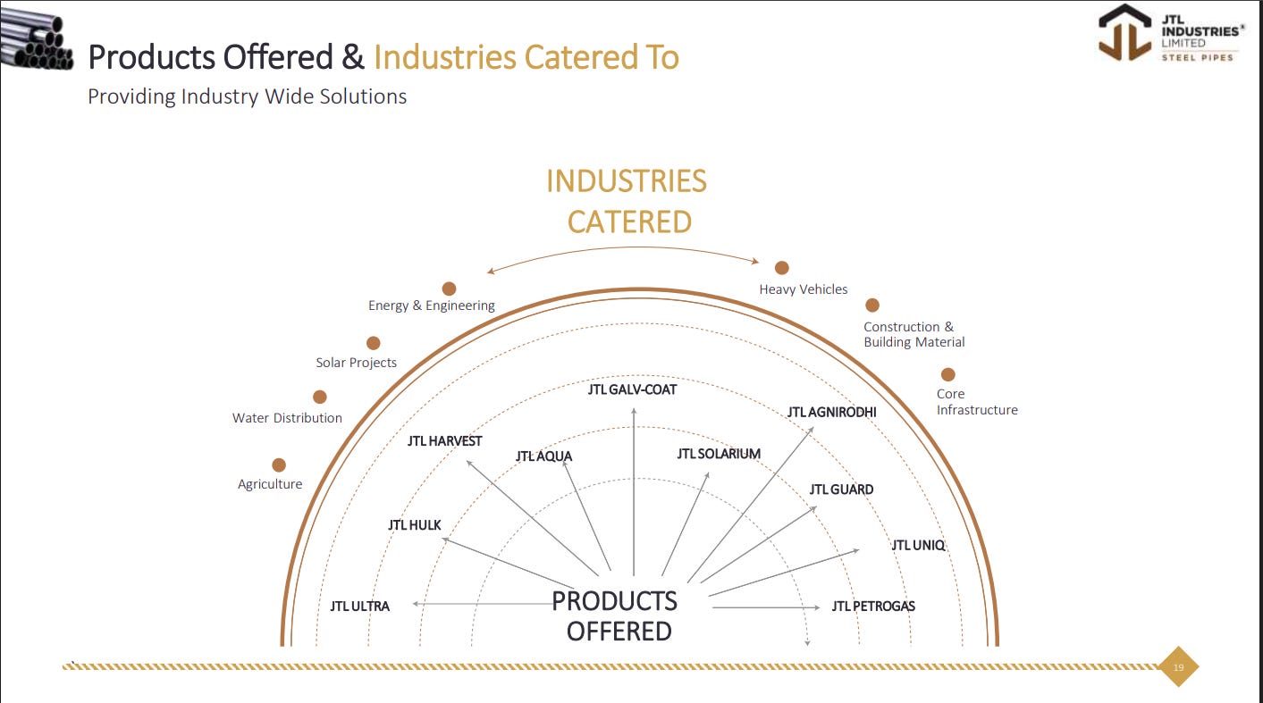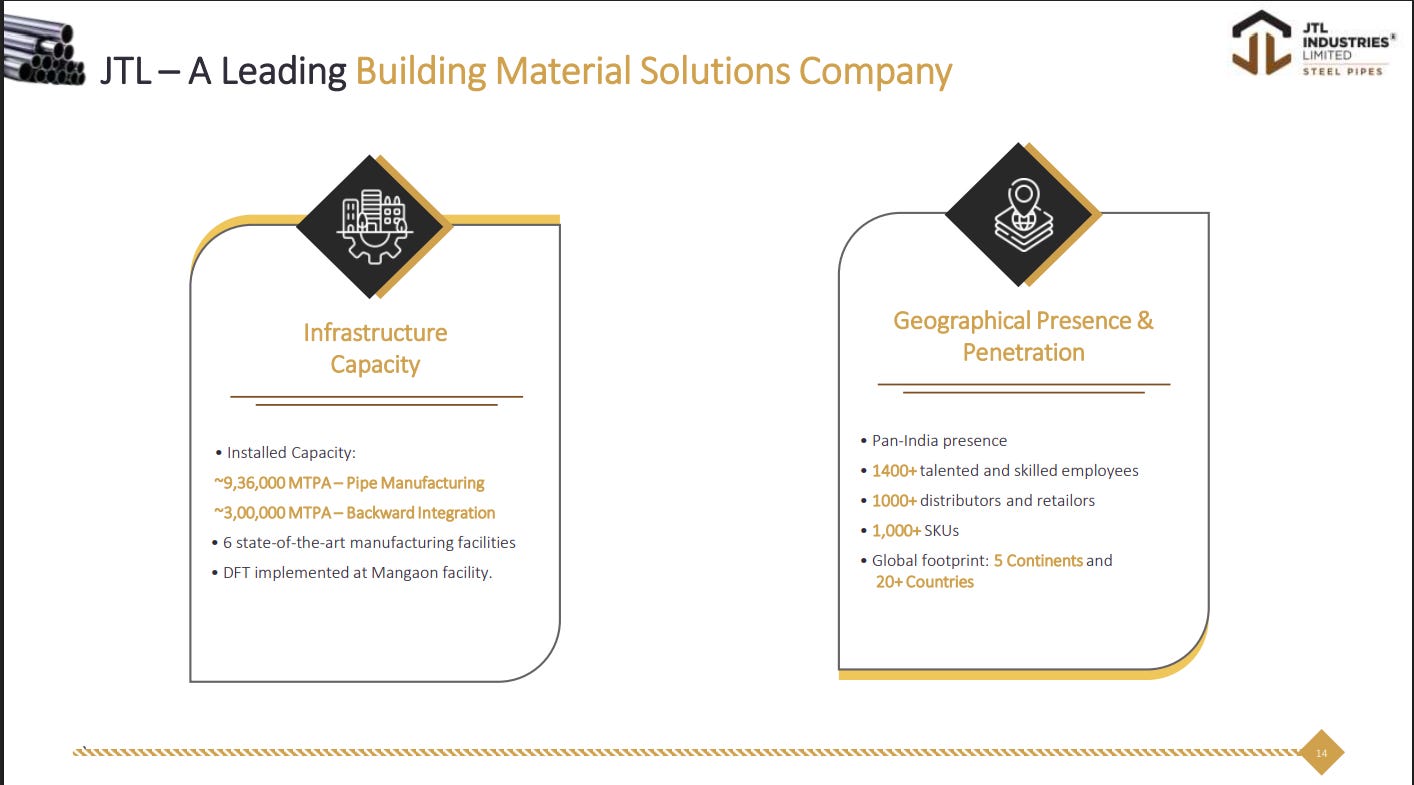 JTL operates with large-scale manufacturing capacity, supported by backward integration and six modern facilities across India. A strong pan-India and global footprint, wide distributor network, and deep SKU portfolio underpin its leadership in steel pipes.