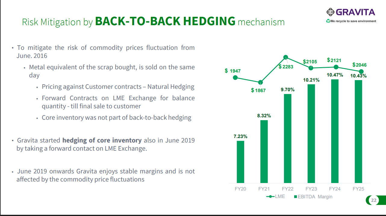 Gravita mitigates commodity price volatility by selling metal equivalents on the same day and using LME forward contracts. Since extending hedging to core inventory in FY19, margins have remained stable despite fluctuations in LME prices.
