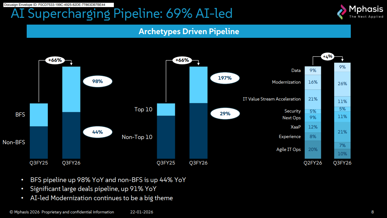 Mphasis’ pipeline is now heavily AI-driven, with 69% of deals being AI-led. The BFS (Banking and Financial Services) pipeline surged 98% year-on-year, while non-BFS grew 44%, resulting in an overall 66% increase in both top 10 and non-top 10 client pipelines. Within the top 10 clients, the pipeline jumped 197% year-on-year, with AI-led modernization now making up 26% of deals (up from 16% in Q2FY26), IT value stream acceleration at 11%, and Agile IT Ops at 10%. The significant large deals pipeline is up 91% year-on-year, and AI-led modernization continues to be a dominant theme across all client segments.