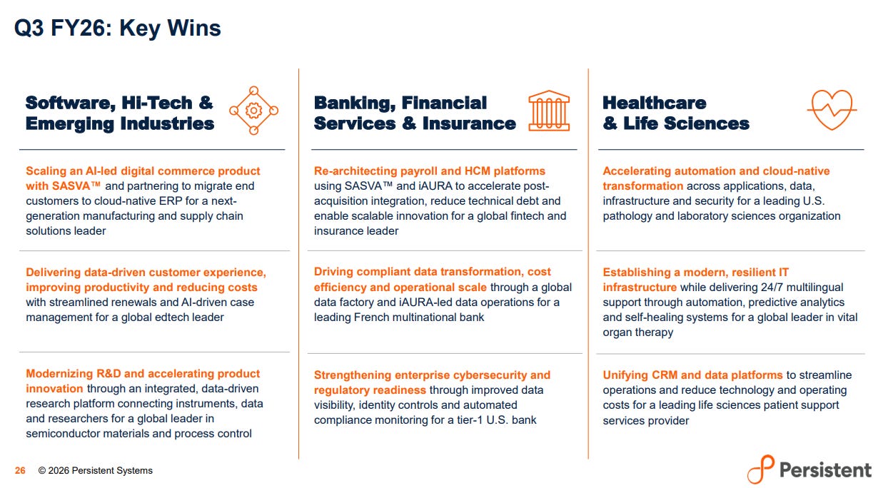 Persistent Systems secured notable client wins across all three verticals in Q3 FY26. In Software, Hi-Tech & Emerging Industries, they’re scaling an AI-led digital commerce product with SASVA, migrating customers to cloud-native ERP for a supply chain leader, delivering data-driven customer experience for a global edtech leader, and modernizing R&D through an integrated research platform for a semiconductor materials leader. In Banking, Financial Services & Insurance, they’re re-architecting payroll and HCM platforms using SASVA and iAURA for a fintech and insurance leader, driving compliant data transformation for a French multinational bank, and strengthening cybersecurity and regulatory readiness for a tier-1 U.S. bank. In Healthcare & Life Sciences, they’re accelerating automation and cloud-native transformation for a U.S. pathology and lab sciences organization, establishing a modern IT infrastructure with 24/7 multilingual support for a vital organ therapy leader, and unifying CRM and data platforms for a life sciences patient support services provider.