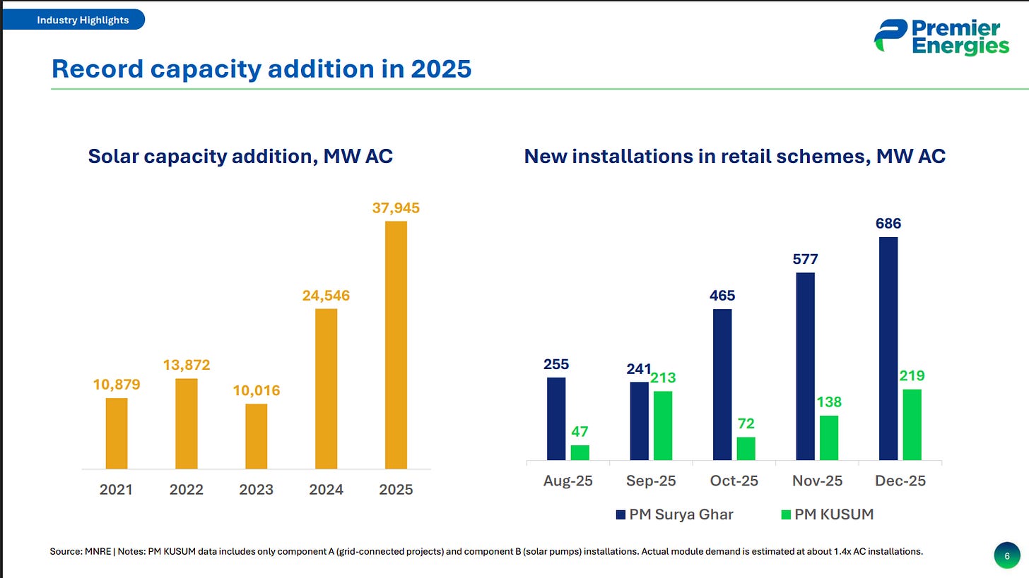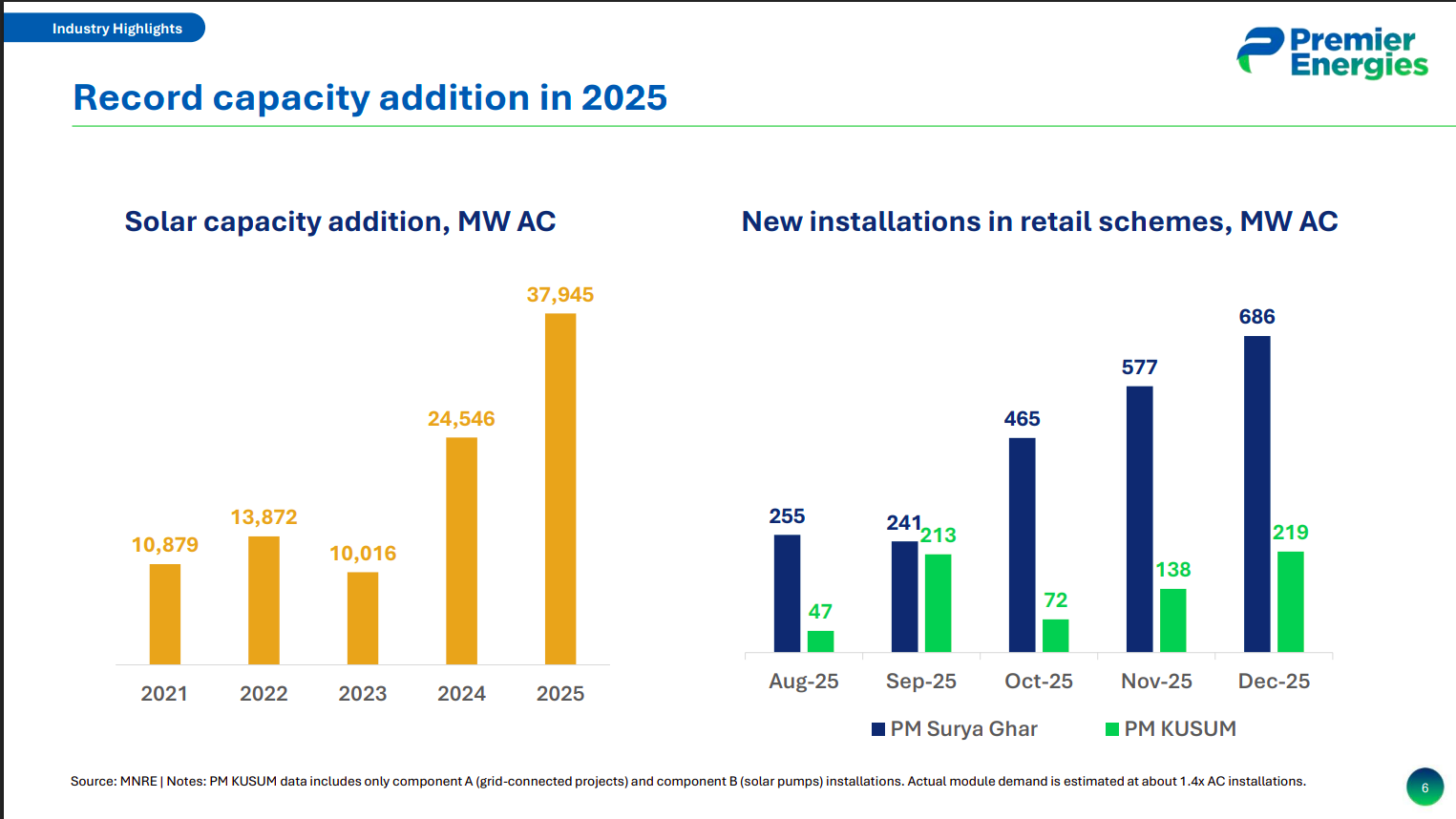 India added a record ~38 GW of solar capacity in 2025, marking a sharp acceleration versus prior years. Retail schemes like PM Surya Ghar and PM KUSUM are gaining momentum, driving sustained module demand into 2026.