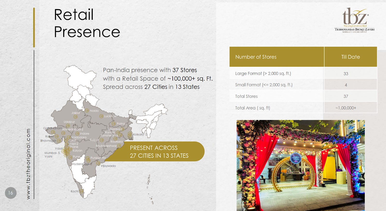 TBZ has a pan-India footprint with 37 stores across 27 cities in 13 states, covering over ~1,00,000 sq. ft. of retail space. The network is largely large-format stores, reinforcing brand visibility and scale in key jewellery markets.