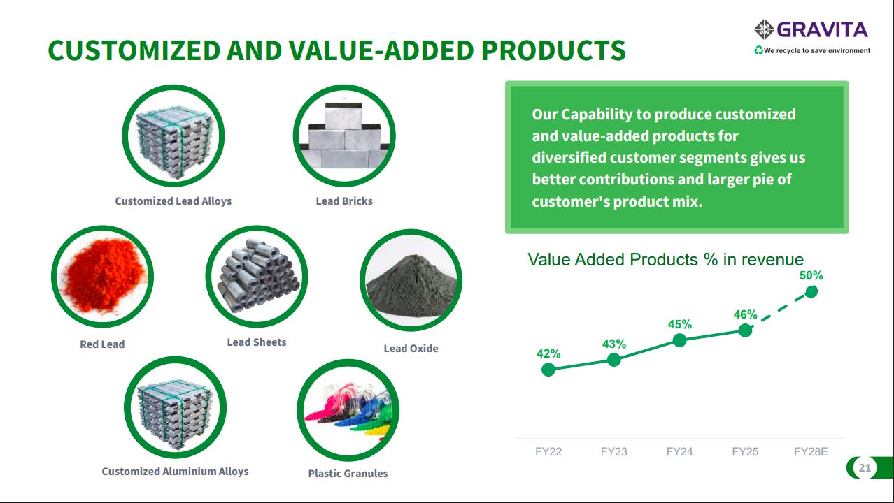 Gravita focuses on higher-margin, customized products like lead alloys, lead oxide, aluminium alloys, and plastic granules to serve diversified customer needs. The share of value-added products in revenue has steadily increased from ~42% in FY22 to ~50% by FY28E, supporting better realizations.