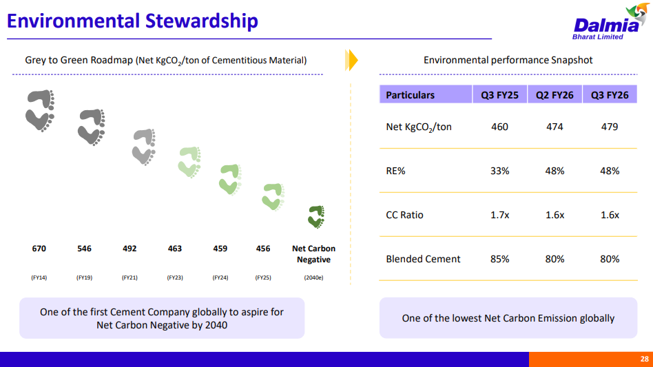 Dalmia Bharat is working toward becoming net carbon negative by 2040, with emissions already dropping from 670 kg CO₂/ton in FY14 to 456 kg CO₂/ton in FY25. Recent quarterly performance shows net emissions have improved from 460 kg CO₂/ton in Q3 FY25 to 479 kg CO₂/ton in Q3 FY26. The company has increased its renewable energy mix to 48% and maintained a clinker-to-cement ratio of 1.6x, while keeping blended cement at 80% of production. These numbers place Dalmia among the lowest carbon emitters globally in the cement industry.