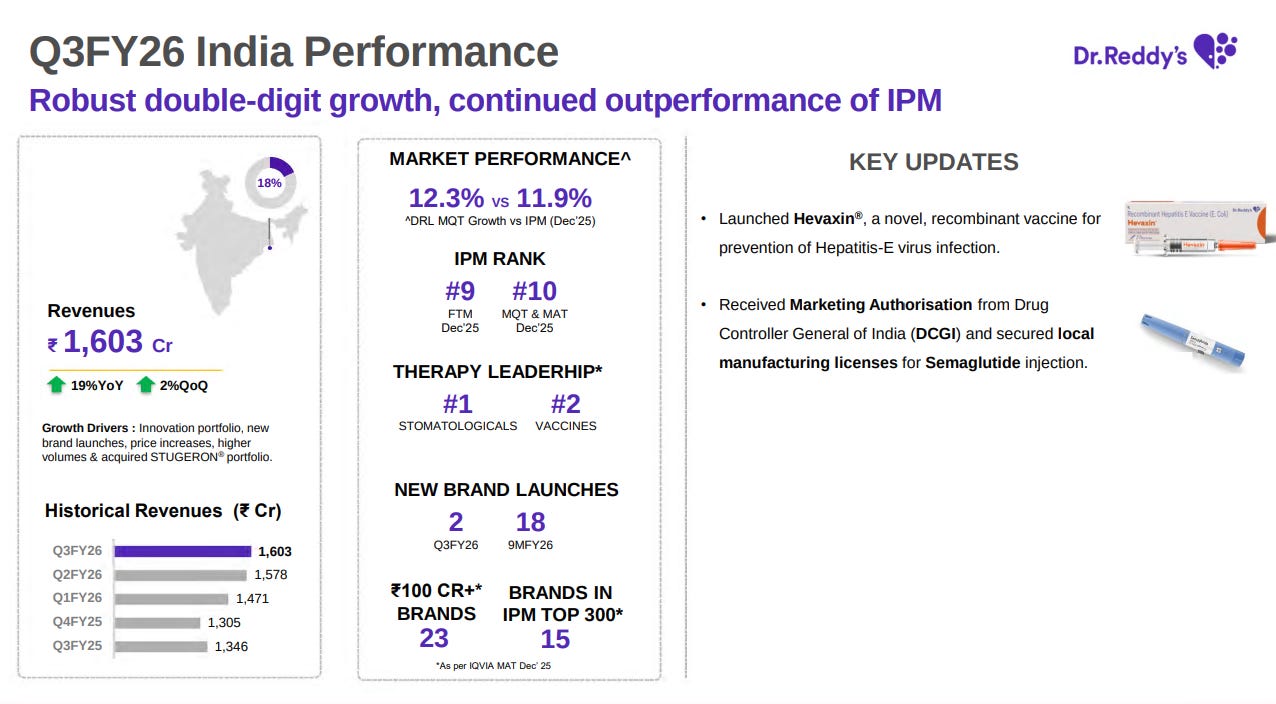 Dr. Reddy’s India business posted revenues of ₹1,603 crore in Q3FY26, up 19% year-on-year and 2% quarter-on-quarter, driven by innovation, new launches, price increases, higher volumes, and the acquired Stugeron portfolio. The company outperformed the Indian Pharmaceutical Market (IPM), which grew at 11.9%, with Dr. Reddy’s clocking 12.3% growth. It ranks #9 in the overall market, #10 in Moving Annual Total (MAT), and holds #1 position in stomatologicals and #2 in vaccines. The quarter saw two new brand launches, taking the nine-month tally to 18, with 23 brands now crossing ₹100 crore and 15 brands in the IPM top 300—plus the launch of Hevaxin, a novel hepatitis-E vaccine, and marketing authorization for Semaglutide injection with local manufacturing licenses secured.