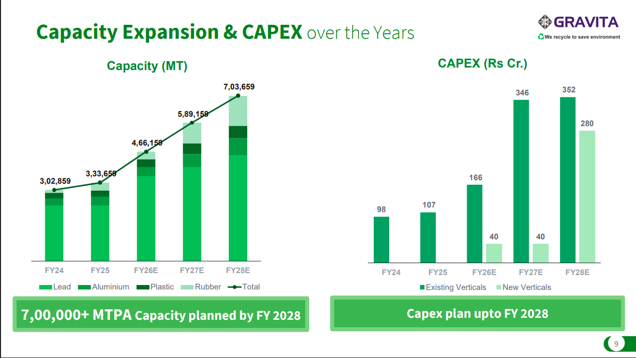 The company plans to scale capacity to over 7,00,000 MTPA by FY28 across lead, aluminium, plastic, and rubber. This growth is backed by a stepped-up capex plan through FY28, with rising investments in both existing and new verticals.