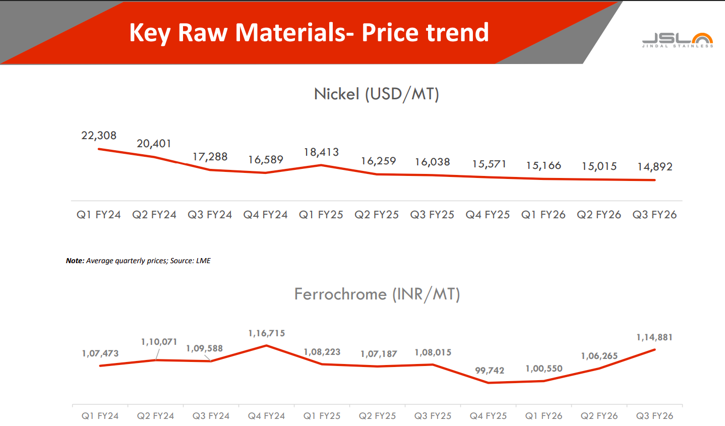 Nickel prices have trended down steadily from FY24 highs, reflecting global oversupply and softer demand, easing raw material pressure for stainless steel producers. Ferrochrome prices remained volatile, dipping in FY25 before recovering into Q3 FY26, indicating some cost normalization but with recent upward momentum.