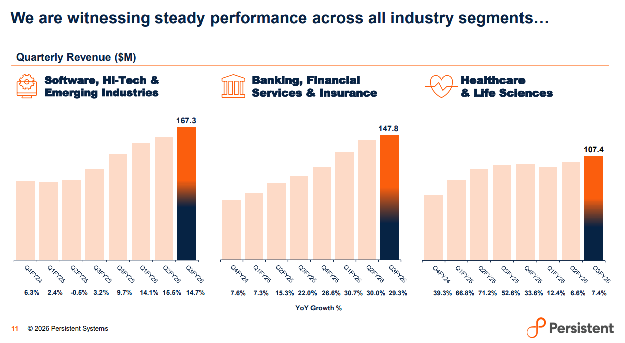 Persistent Systems is seeing consistent growth across its three main verticals. Software, Hi-Tech & Emerging Industries posted quarterly revenue of $167.3 million in Q3FY26, growing 14.7% year-on-year after peaking at 15.5% in Q2FY26. Banking, Financial Services & Insurance reached $147.8 million with a strong 29.3% year-on-year growth, accelerating from 30% in the previous quarter. Healthcare & Life Sciences generated $107.4 million in revenue with 7.4% year-on-year growth, down from double-digit growth rates seen in earlier quarters but showing steady sequential momentum.