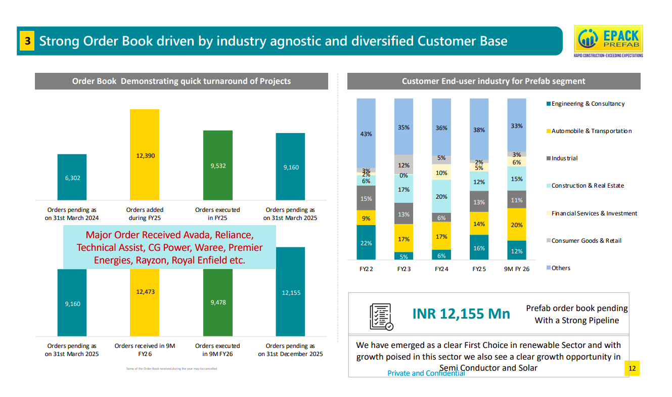 EPack Prefab’s order book reflects fast project execution and strong repeat demand across industries, with orders added and executed quickly each year. A diversified end-user mix and marquee clients support a robust pending order book of ₹12,155 mn and a strong pipeline.