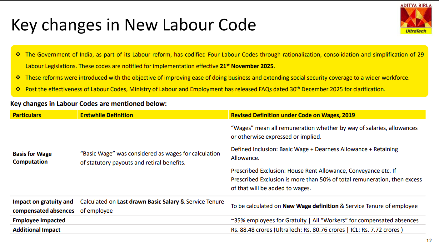 The new labour codes expand the definition of wages, increasing gratuity and compensated absence liabilities for companies. For UltraTech and India Cements, the one-time impact is estimated at ₹88.5 crore, affecting ~35% of employees for gratuity calculations.