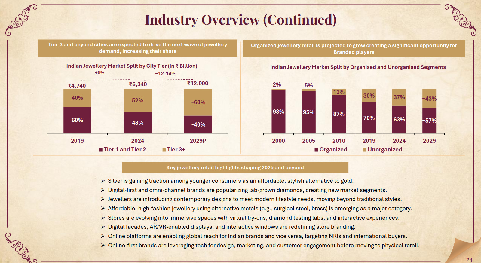 Tier-3 and smaller cities are emerging as the next growth engine, with their share of jewellery demand steadily rising. Organised retail is gaining ground over unorganised players, creating a long runway for branded jewellers as formats, designs, and customer experiences modernise.