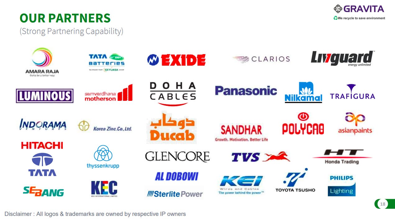 Gravita works with a wide range of marquee global and Indian partners across batteries, cables, autos, paints, and industrials. These long-standing relationships highlight its credibility, scale, and integration across recycling and materials value chains.