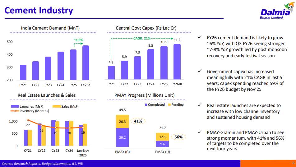 Cement demand is expected to grow around 6% year-on-year in FY26, with Q3 showing stronger momentum thanks to the monsoon recovery and festival season. Government spending on infrastructure has been climbing steadily—capex grew at 21% CAGR over the last five years and made up 59% of the FY26 budget by November 2025. On the housing front, real estate launches are picking up as inventory levels drop, and government housing schemes like PMAY-Gramin and PMAY-Urban are making solid progress, with 41% and 56% of their targets already completed.