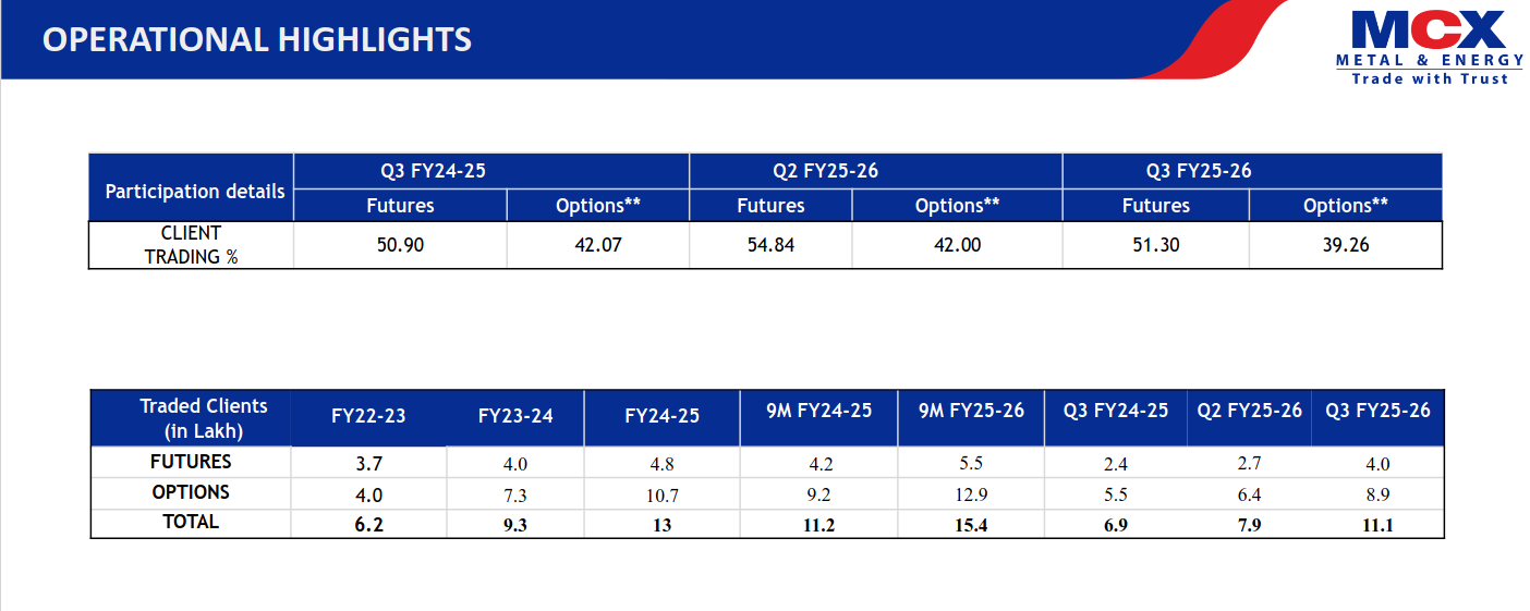 Client participation strengthened across both futures and options, with steady trading intensity despite quarterly volatility. Traded clients increased meaningfully in 9M FY26, driven largely by faster growth in options participation.