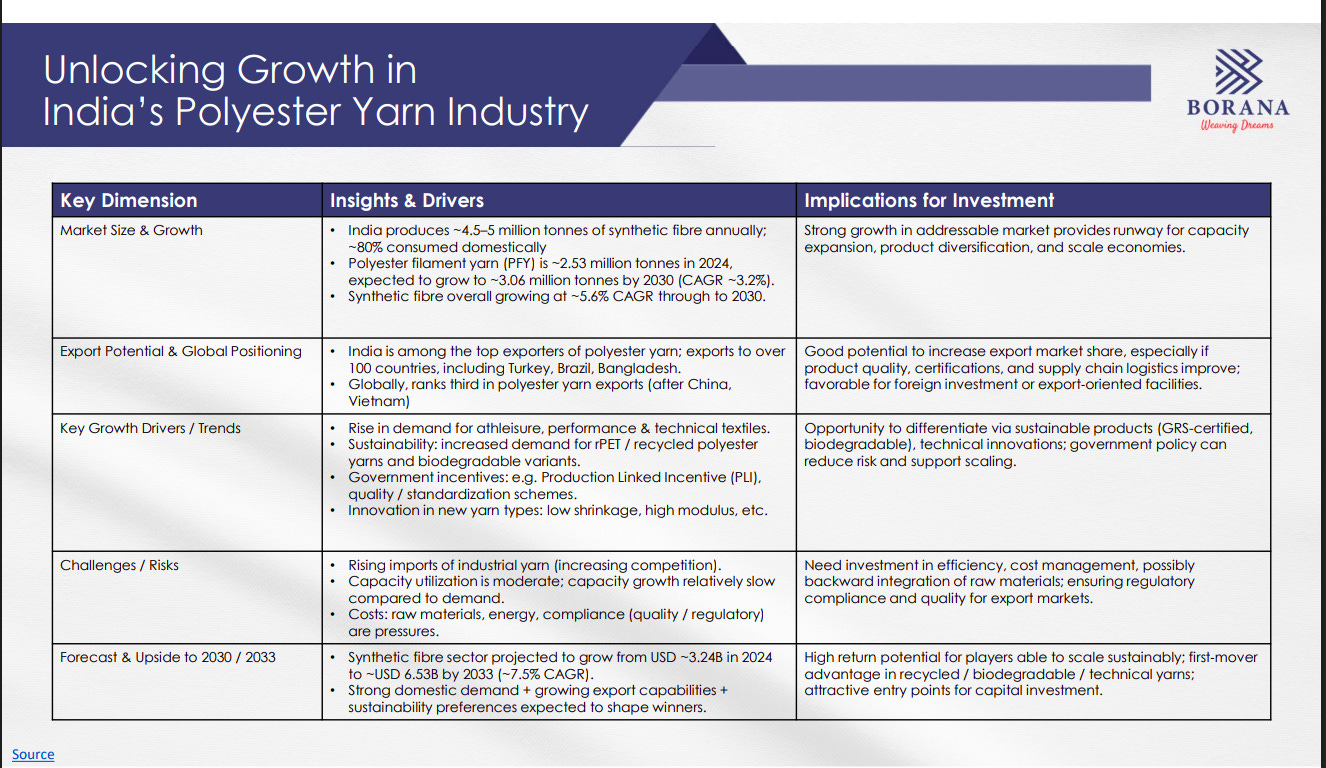 Borana’s portfolio spans unbleached synthetic greige fabric and PTY yarn, serving apparel, home textiles, and industrial applications. This diversified application base reduces concentration risk and supports stable demand across cycles.