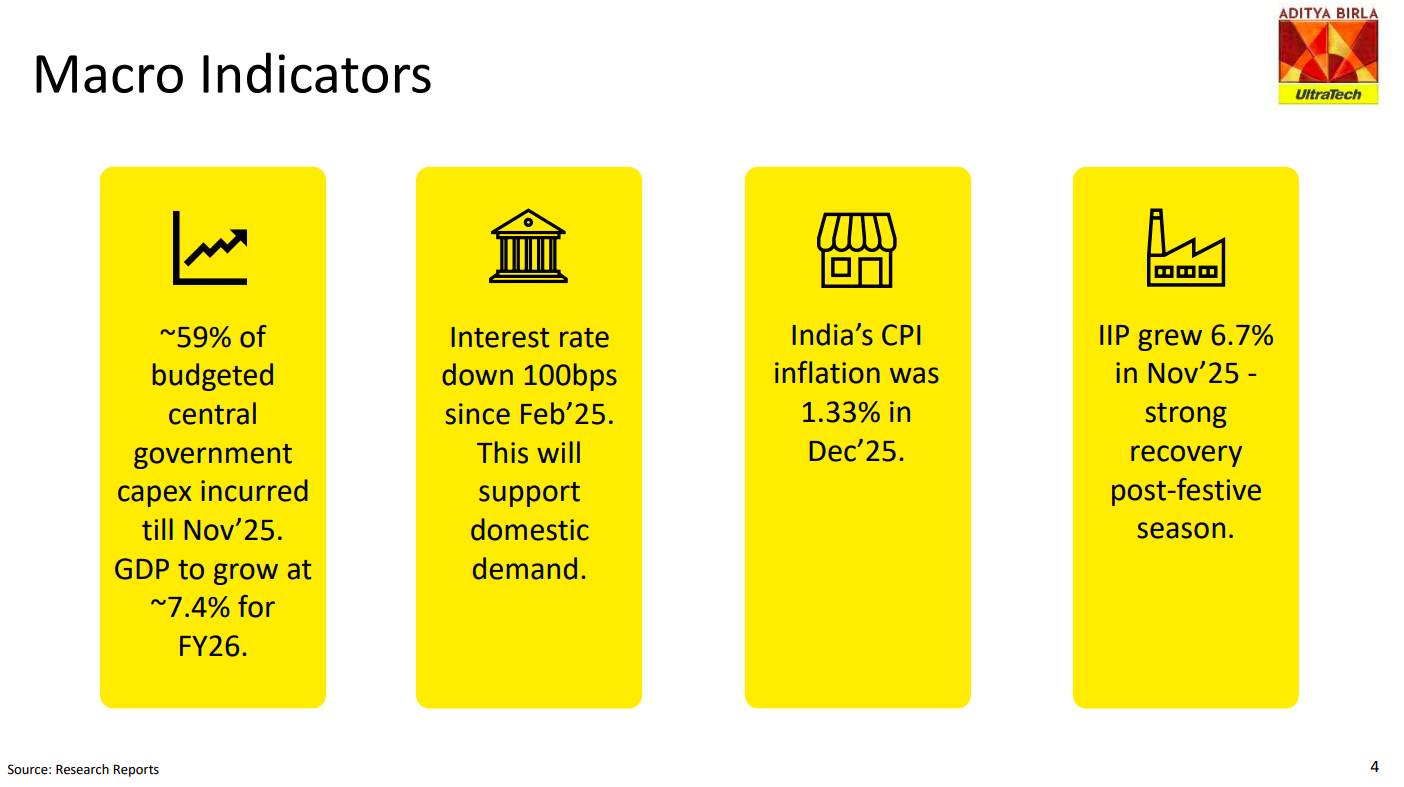 Macro conditions remain supportive with strong government capex execution, easing interest rates, low CPI inflation, and improving industrial activity. These factors are expected to sustain construction demand momentum into FY26.